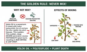 چرا؟ روغن ولک خاصیت نفوذکنندگی دارد. اگر گوگرد همراه آن باشد، روغن باعث میشود گوگرد به سرعت به داخل بافتهای گیاهی نفوذ کند. این نفوذ ناگهانی منجر به گیاهسوزی شدید (Phytotoxicity)، خشک شدن جوانهها و ریزش برگها میشود.