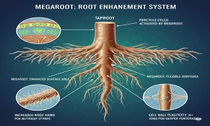 - افزایش تارهای کشنده: تارهای کشنده، دهانهای اصلی گیاه هستند. مگاروت با افزایش چگالی این تارها در هر میلیمتر از سطح ریشه، سطح تماس با محلول خاک را به صورت نمایی بالا میبرد.