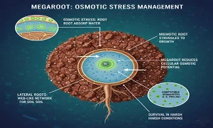 ۲. مدیریت تنش اسمزی در خاکهای سخت: وقتی خاک شور است یا تراکم بالایی دارد، ریشه توان مکش آب را از دست میدهد. مگاروت حاوی “اسمولیتهای سازگار” مثل پرولین است. این مواد پتانسیل اسمزی داخل سلول ریشه را بدون ایجاد مسمومیت، کاهش میدهند. نتیجه؟ ریشه میتواند حتی از خاکهای تشنه و سفت هم آب بیرون بکشد. این یعنی بقا در شرایطی که بقیه گیاهان از پا در میآیند.