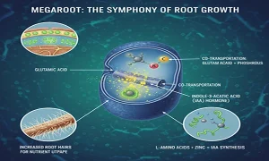 بیایید باهم سری به موتورخانه سلولی گیاه برویم. اگر فکر میکنید رشد ریشه صرفاً با بالا بردن درصد فسفر در فرمولاسیون اتفاق میافتد، باید بگویم این یک باور منسوخ است. توسعه ریشه یک سمفونی پیچیده از پیامرسانهای شیمیایی است که مگاروت رهبری آن را بر عهده دارد. در لایههای مولکولی، مگاروت از پدیده “Co-transportation” یا انتقال همزمان استفاده میکند. پیوند میان گلوتامیک اسید و فسفر در این ترکیب، باعث میشود که فسفر با سرعت خیرهکنندهای از غشای سلولی عبور کند. این یعنی بمباران انرژی در ناحیه مریستم. بررسیهای فیزیولوژیکی نشان میدهد که حضور اسیدهای آمینه چپگرد (L-Amino Acids) در کنار عناصر ریزمغذی مثل روی، به سنتز درونی هورمون “ایندول استیک اسید” (IAA) کمک میکند. این دقیقاً همان جادویی است که ریشه را به جلو میراند.