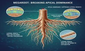۱. شکستن برتری جوانه انتهایی ریشه (Apical Dominance): داستان از این قرار است که ریشه اصلی همیشه میخواهد به سمت اعماق برود و مانع رشد ریشههای جانبی شود. مگاروت با تنظیم نسبت اکسین به سیتوکنین در بافت “پریسیکل” (Pericycle)، سیگنال توقف رشد عرضی را خنثی میکند. این یعنی به جای یک ریشه طویل و تنها، ما با تودهای از ریشههای جانبی روبرو میشویم که مثل یک شبکه تارعنکبوتی خاک را در بر میگیرند.