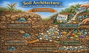 کلسیم یک یون دو ظرفیتی (Ca++) است. این یعنی دو دست دارد که میتواند با آنها ذرات خاک (رس و مواد آلی) را که بار منفی دارند، به هم بچسباند. این فرآیند که “فلوکولاسیون” نام دارد، باعث تشکیل خاکدانههای درشت و پایدار میشود.