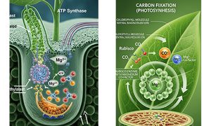 - تثبیت کربن (فتوسنتز): حدود ۱۵ تا ۳۵ درصد از کل منیزیم گیاه در مرکز مولکول کلروفیل قرار دارد. علاوه بر این، منیزیم کوفاکتور اصلی آنزیم روبیسکو (Rubisco) است. این آنزیم اولین مرحله از تبدیل CO₂ به قندها را در چرخه کالوین انجام میدهد. فعالیت بهینه روبیسکو به معنای تولید بیشتر کربوهیدراتهایی است که اسکلت کربنی لازم برای ساخت اسیدهای چرب را فراهم میکنند.