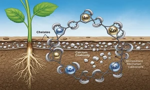 بیولم حاوی ترکیبات آلی خاصی است که مانند یک “چنگک” (Chelate) دورِ عناصر ریزمغذی میپیچند. این پوشش آلی، از تماس مستقیم عنصر با آهک خاک جلوگیری میکند. در نتیجه، آهن یا روی اکسید نمیشود و به فرم قابل جذب در اختیار ریشه قرار میگیرد. بسیاری از کشاورزان هزینههای سنگینی برای کودهای کلاته شیمیایی (EDTA) میدهند، در حالی که بیولم کارخانهی تولید کلات طبیعی در خاک شماست.